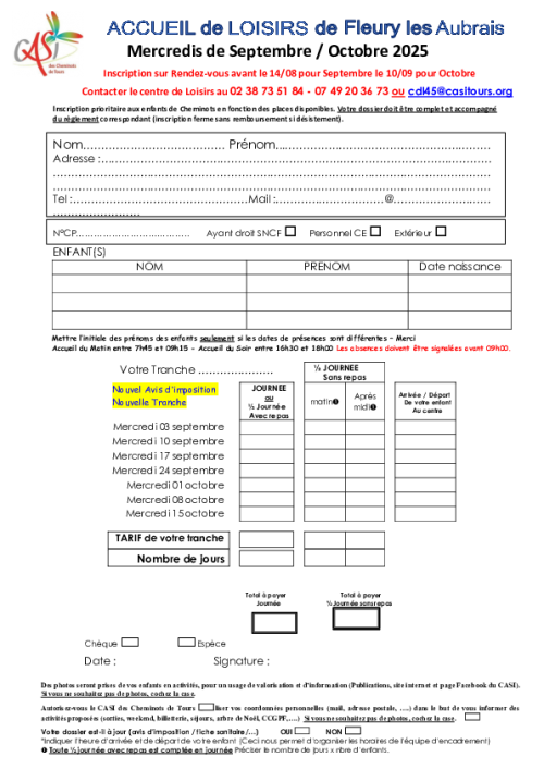Inscriptions Mercredis Les Aubrais de septembre 2025 à juillet 2026