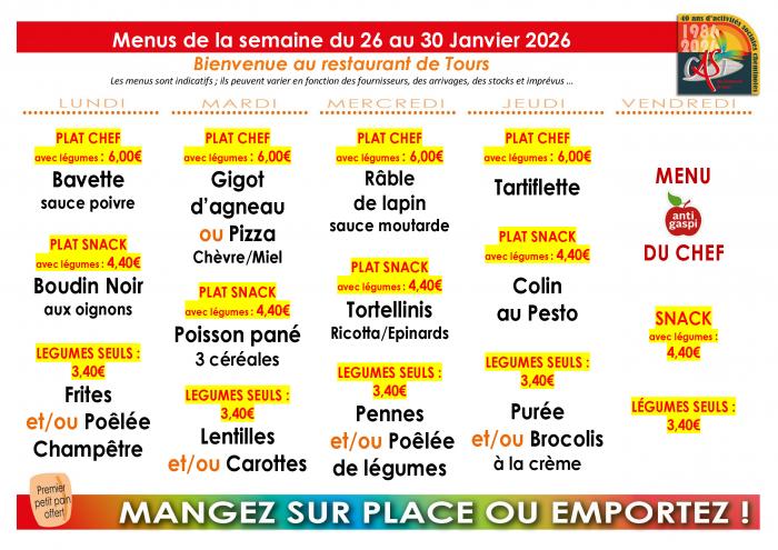 Les menus sont indicatifs; ils peuvent varier en fonction des fournisseurs, des arrivages et des stocks.