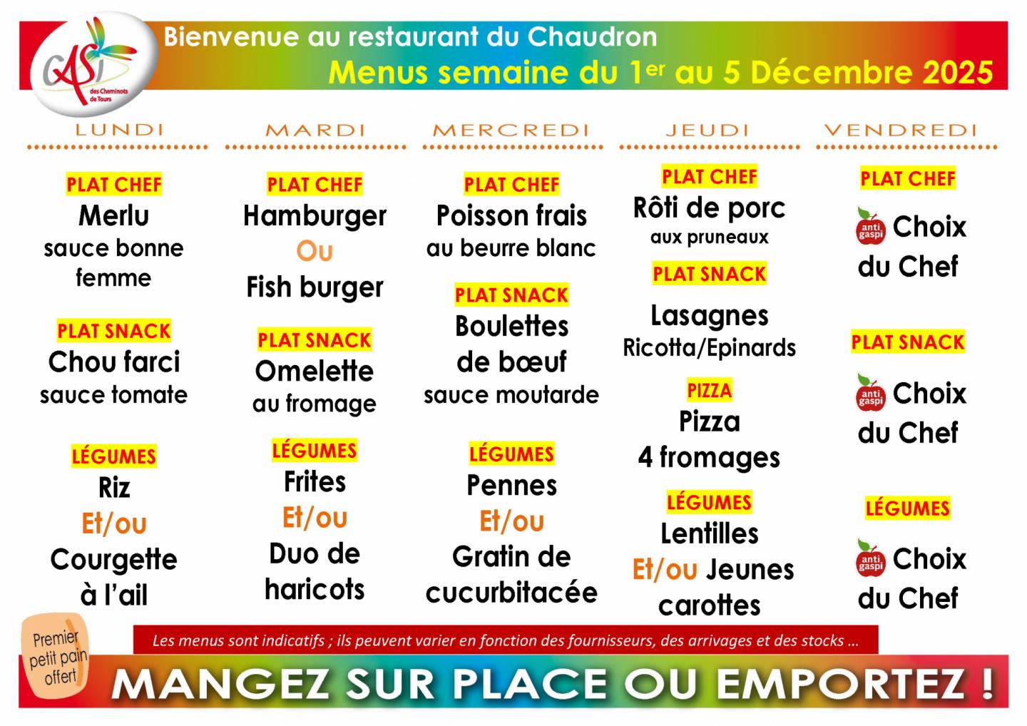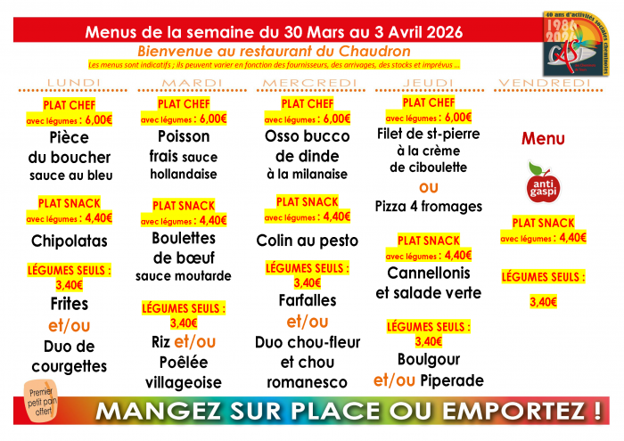 Les menus sont indicatifs; ils peuvent varier en fonction des fournisseurs, des arrivages et des stocks.