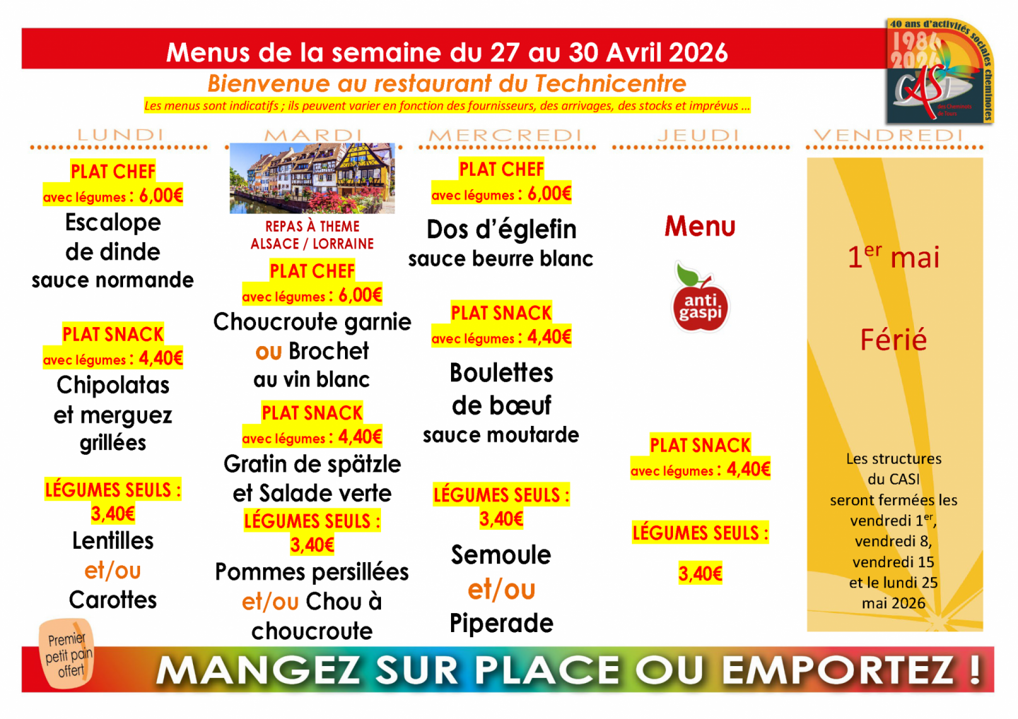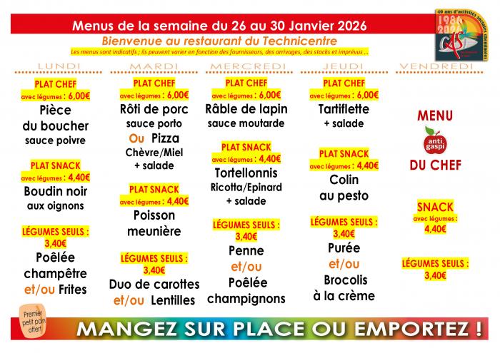 Les menus sont indicatifs; ils peuvent varier en fonction des fournisseurs, des arrivages et des stocks.
