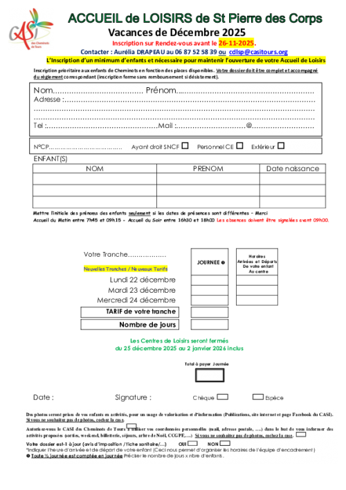 Inscription Vacances St Pierre des Corps Décembre 2025